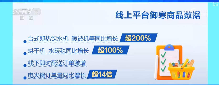 线上平台的数据显示,台式即热饮水机、暖被机等同比增长超200%;烘干机、水暖毯同比增长超100%。线下即时配送订单激增,电火锅订单量同比增长超14倍。火锅相关商品同步热销,火锅肉卷成交额同比提升76%、线%、黑虎虾成交额同比增长58.69%。毛呢大衣、羊绒衫、皮草等服装品类成交额同比增长均超100%。浙江义乌:取暖用品热销 追加订单客户增多