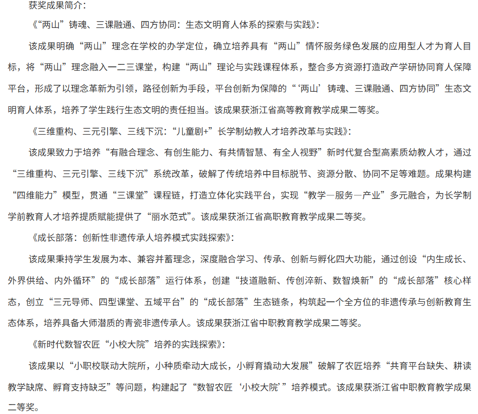 学校始终坚守“服务绿色发展”的应用型办学定位,系统推进教育教学领域的各项改革,构建起了特色鲜明的山区人才培养体系。近年来,学校围绕特色办学、数智赋能、产教融合、协同育人等方面持续深化探索,先后出台多项支持教育教学创新的政策举措,鼓励教师开展教育教学研究与成果转化,为教学成果的培育与落地提供了良好环境。获奖成果展现了学校在生态文明育人、“儿童剧+”长学制幼教人才培养、非遗传承人培养、中本一体化改革等领域取得的改革经验,彰显了学校在高素质应用型人才培养上的扎实功底。