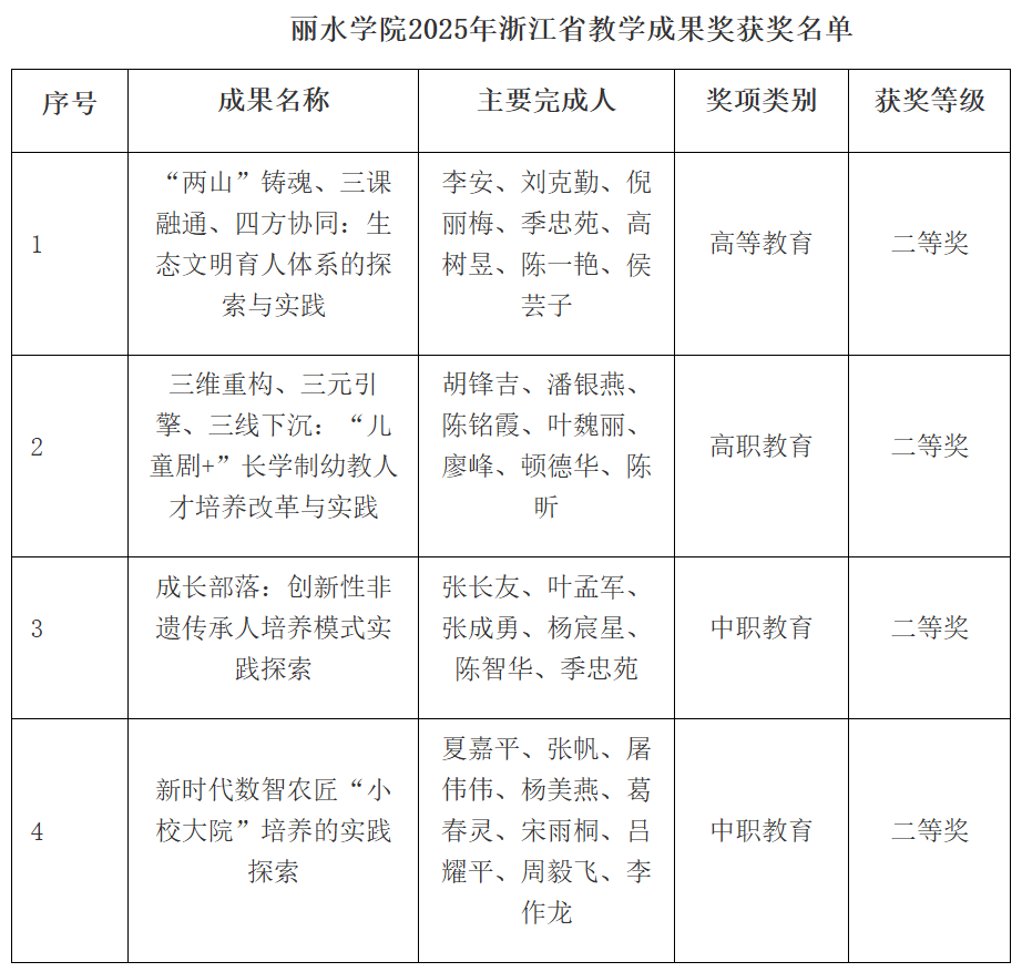 近日,浙江省教育厅正式公布《2025年浙江省教书育人杰出贡献奖名单》,我校4项成果荣获2025年浙江省教学成果奖,其中以第一完成单位获二等奖2项,以第二完成单位获二等奖2项。