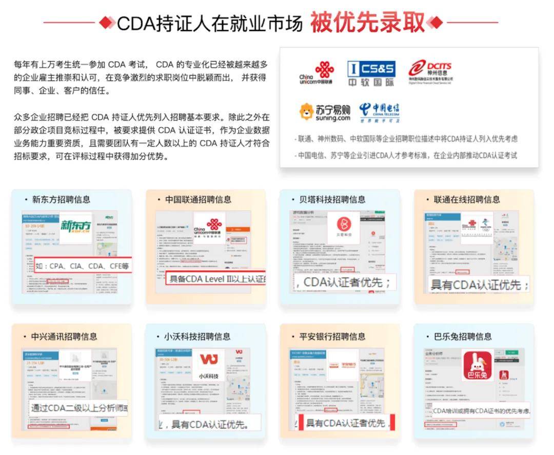 CDA企业认可度如何?实际情况是,CDA的行业认可度极高。目前,众多企业在招聘JD中明确标注“CDA数据分析师优先”。特别是在中国联通、央视广电、德勤、苏宁以及各大国有银行和金融机构中,CDA持证人被列为优先录用或晋升考察的对象。