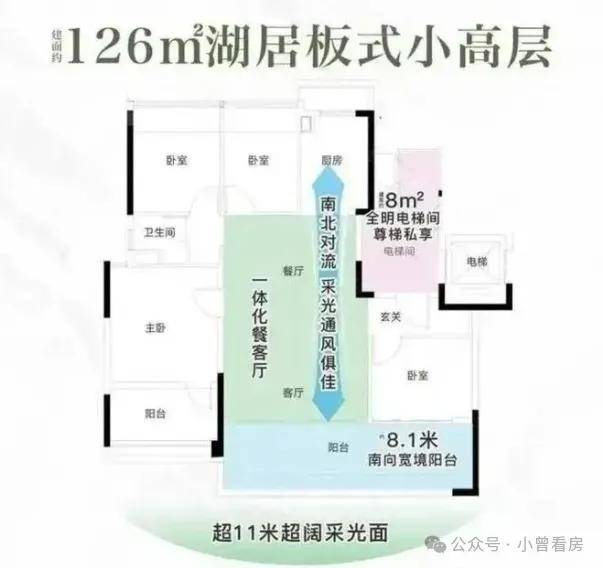 其中126㎡四房是刚需偏改善的主力户型,2025 年五一期间刚加推,总价约 850 万起,采用三开间朝南设计,LDKB 一体化布局让客餐厨阳台连通,客厅面宽约 4.5 米,主卧带独立卫浴和飘窗,部分楼层能看到湖景,很适合在智谷或珠江新城上班的年轻家庭。