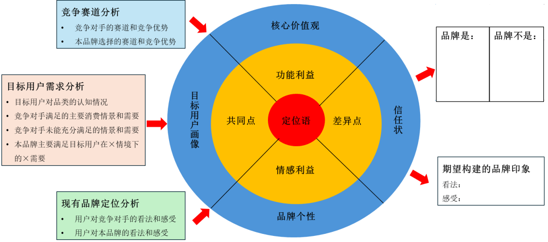 要达成这些认知的目标,很难依靠一句定位语就实现,所以,品牌定位需要有一个帮助品牌建立认知的完整框架,而不是仅仅一句话。这个框架包括:品牌的用户画像、品牌的核心价值观、品牌个性、品牌与主要竞争对手或者某个品类的相同点和差异点、品牌的利益点以及利益点的表达方式。