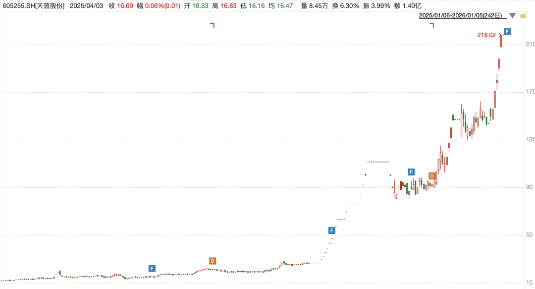 盘面上,天普股份(605255)自2025年12月31日起停牌,为近四个月第五次停牌核查。2025年,公司股价从年初12.59元/股涨至年末的218.02元/股,累计涨幅达1645.35%。