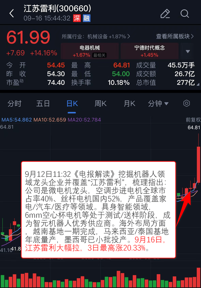 9月12日11:32《电报解读》 挖掘机器人领域龙头企业并覆盖“江苏雷利”,梳理指出:公司是微电机龙头,空调步进电机全球市占率40%、丝杆电机国内52%,产品覆盖家电/汽车/医疗等领域。具身智能领域,6mm空心杯电机等处于测试/送样阶段,成为智元机器人优秀供应商。海外布局方面,越南基地一期完成,马来西亚/泰国基地年底量产,墨西哥已小批投产。9月16日,江苏雷利大幅拉,3日最高涨20.33%。