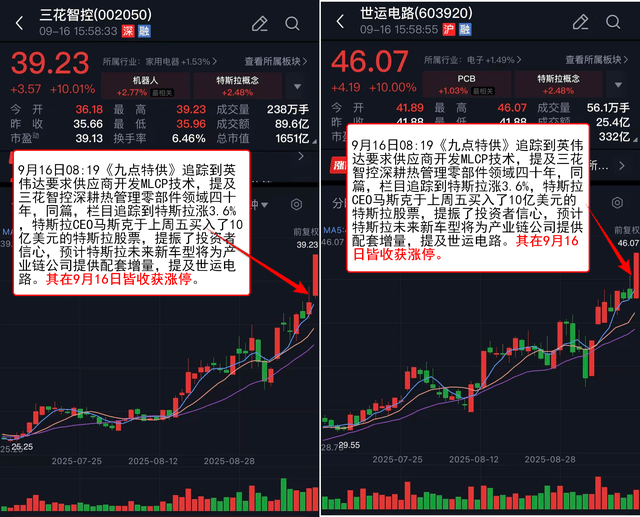 9月16日08:19《九点》 追踪到英伟达要求供应商开发MLCP技术,提及三花智控深耕热管理零部件领域四十年,同篇,栏目追踪到特斯拉涨3.6%,特斯拉CEO马斯克于上周五买入了10亿美元的特斯拉股票,提振了投资者信心,预计特斯拉未来新车型将为产业链公司提供配套增量,提及世运电路。其在9月16日皆收获涨停。