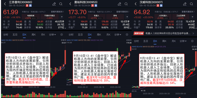 9月10日13:41《盘中宝》 解读机器人方向的发展前景,引用分析师观点并指出:目前人形机器人进入工业场景,已经成为国内外确定性较高的应用趋势,人形机器人商业化落地可期,建议关注受益的国内零部件厂商。文章提及江苏雷利、震裕科技、汉威科技在内的多家上市公司,截至9月16日收盘,其中江苏雷利最高涨幅达25.4%,震裕科技最高涨幅达10.35%,汉威科技最高涨幅达23.54%。