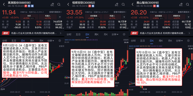 9月15日10:34《盘中宝》 发布文章解读机器人方向,文章引用分析师观点并指出:机器人产业发展日新月异,腱绳传动作为机器人灵巧手必不可少的传动模式,并且有望拓展至其他关键关节部位,预计拥有着巨大空间,关注超高分子量聚乙烯纤维、PBO产业链的投资机会。提前储备前端材料的企业具备先发优势,有望优先打入腱绳赛道,进一步渗透进产业链。文章提及南山智尚、恒辉安防、高测股份在内的多家灵巧手供应商,截至9月15日收盘,南山智尚区间最高涨幅达10.02%,恒辉安防区间最高涨幅达13.3%,高测股份区间最高达10.03%。