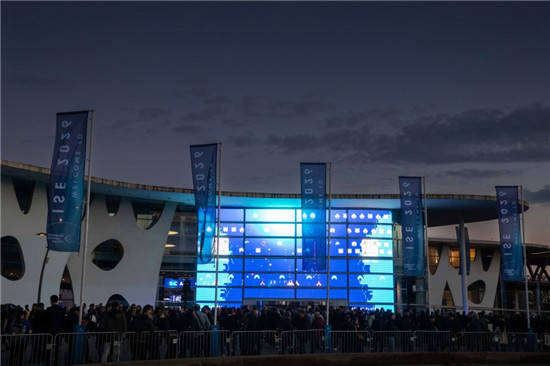 ▲ 与会者驻足于气势恢宏的130英寸Micro RGB数字标牌QPHX前。