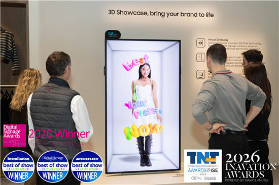 ISE 2026现场,三星Spatial空间显示屏获得业界广泛认可,斩获多类别奖项荣誉,包括: