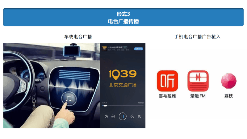 电台广播传播 电台广播作为伴随性媒体,适合覆盖通勤、驾驶等场景。洛芙可选择车载电台(如北京交通广播FM103.9等)及手机电台平台(喜马拉雅、荔枝FM等)投放品牌歌曲: - 车载电台:在早晚高峰时段的交通节目中插播,契合车主通勤时的听觉需求,强化“开车时听,下车后记”的记忆场景; - 手机电台:结合健康、生活类节目进行软性植入,将品牌歌曲与脚气护理知识结合,提升传播的精准度。