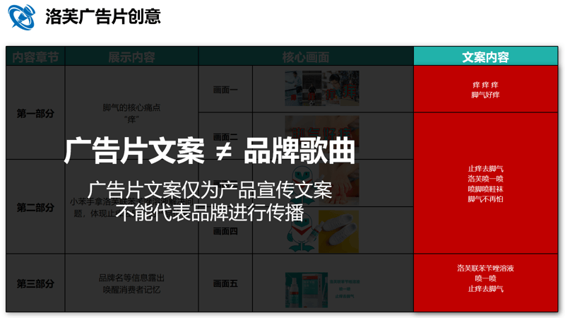 锚定品牌核心资产 品牌核心资产的确定是歌曲创作的前提。通过对脚气药品类的深度调研发现,消费者对脚气药的核心需求高度集中在“快速止痒”——定性调研显示,“痒”是脚气患者最迫切希望解决的症状,“快速起效”是衡量产品价值的首要标准。 基于此,洛芙品牌传递给消费者的核心资产被精准锁定为“快速止痒”。这一核心资产既契合品类本质需求,又能与竞品形成差异化区隔,成为品牌歌曲的核心传播点。